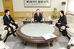 | <김종성 교육감(가운데)이 충청남도 학교4-H육성 필요성에 대해 이용복 충남4-H본부회장(왼쪽)과 조두현 한국4-H본부 홍보부장(오른쪽)에게 설명하고 있다.> |