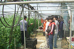 토마토 농장을 견학하며 지역농업 현황을 조사하고 있는 무선중4-H회원들의 모습. |