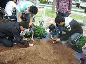 | 5월 5일 어린이날 어린이와 함께 화분 만들기를 하고 있는 무선중4-H회. |