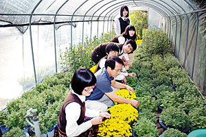 | 비닐하우스의 국화는 회원들의 싱그러움을 닮아 활짝 피어 있다. |