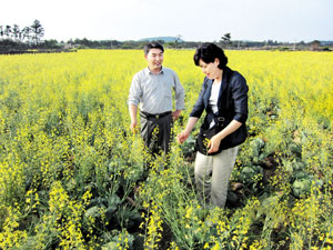 | 유채꽃을 연상시키는 양배추밭에서 기자와 환담을 나누고 있다. |