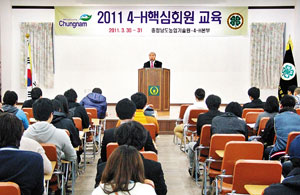 충남4-H핵심회원 교육에서 회원들에게 충남4-H의 활성화를 위해 한마음으로 노력해 나가자고 당부하는 이정우 회장. |