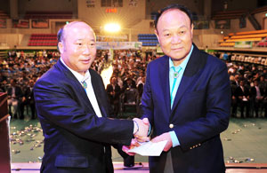 | 이성원 지도자가 4-H발전기금 1백만원을 이정우 충남4-H본부 회장에게 전달하고 있다. |
