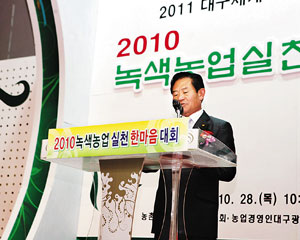 | 2010년도 대구광역시 농업인단체 한마음대회에서 대회사를 하고 있는 김정립 지도자. |