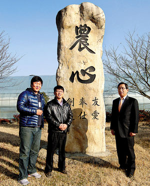 | 김지훈 회장의 든든한 버팀목인 밀양시 농업기술센터 농업지원담당 박상률 계장(오른쪽), 최승룡 지도사(가운데)와 함께. |