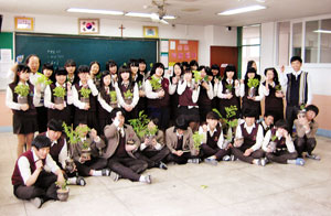 이 학교 2학년 1반 교실. 강사인 김창환 전 한국4-H본부 교육홍보국장의 지도 아래 37명의 회원이 정성껏 화분을 만들고 있었다. 회원들은 먼저 미쓰김라일락, 병꽃나무, 솔채꽃, 당비싸리 가운데 자기가 심을 꽃나무를 하나씩 골랐다. 또 도자기 화분에 굵은 흙을 넣은 다음 다시 거름흙을 넣고 포트에서 꽃나무를 조심스럽게 뽑아 흙을 털어 화분에 심었다.