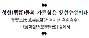 그러므로 ‘횡설수설(橫說竪說)’이다. 그런데 공부가 깊지 못한 사람들은 율곡의 이러한 설명을 잘 이해하지 못한다. 그러니 ‘도대체 무슨 말을 하는 거야?’라고 고개를 갸우뚱거릴 수밖에.