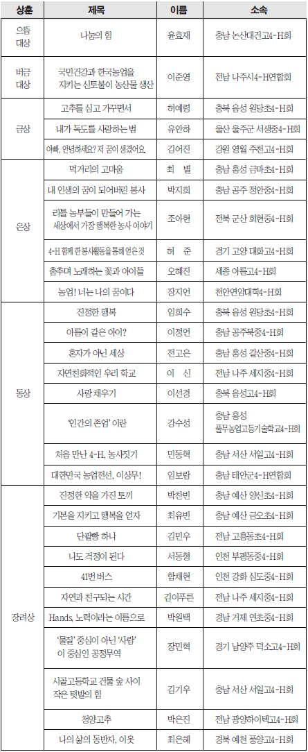 제15회 전국4-H회원 사이버백일장 입상자 명단