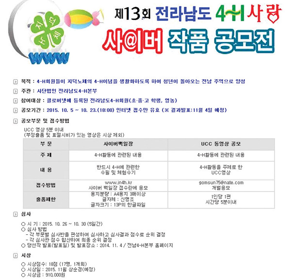 전라남도4-H본부(회장 임재상)는 회원들의 문예 및 UCC 창작능력을 배양하는 제13회 전남4-H사랑 사이버작품전을 개최한다.〈사진〉