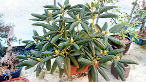 길이 20㎝정도의 매우 큰 잎은 가죽같이 빳빳하고 잎의 가장자리는 밋밋하며 뒤쪽으로 약간 말려든다. 길쭉한 피침꼴에 가까운 잎은 서로 어긋나게 자라지만 가지 끝에는 5~7장의 잎이 모여 달린다. 잎 표면은 짙은 녹색이고 뒷면은 회갈색의 잔털이 빽빽하게 나 있다. 겨울이 되면 잎이 뒤로 말리는데 이는 추위로부터 스스로를 보호하고 수분증발을 최소화하기 위한 방편이다.