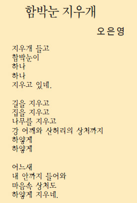 게 덮어 준다. 눈을 오래오래 바라보고 있노라면 “어느새/내 안까지 들어와/마음속 상처도/하얗게 지”운다. 눈이 내리는 아름다운 풍경을 그리는 데 그치지 않고, 난개발로 훼손되는 자연의 상처까지 보듬고 싸매 주는 시인의 건강한 의식이 돋보이는 작품이다.