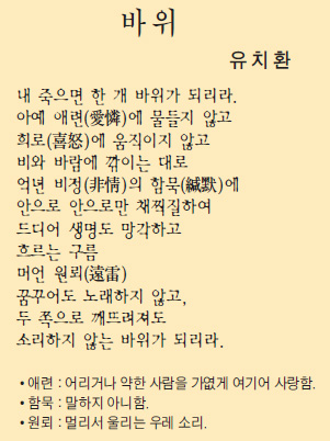 청마 유치환은 ‘의지의 시인’으로 불리는데, 시인의 그런 특성이 잘 드러난 작품이다. 시인은 ‘내 죽으면 한 개 바위가 되리라.’고 말한다. 그러고는 왜 바위가 되려는지 그 이유를 설명한다. 시인에게 바위는 생명 의지의 상징물이다. 바위는 ‘애련’, ‘희로’ 등 개인적인 감정에 흔들리지 않고, ‘비와 바람에 깎이는 대로’ 모든 시련을 묵묵히 견디며 ‘안으로 안으로만 채찍질하여’ 생명도 망각할 수 있는 경지에 이르러 있다. 시인은 이런 바위가 되어 인간의 모든 것을 초월하는 무아의 경지에 도달하겠다는 것이다. 따라서 이 시는 바위를 통하여 동양적인 정신을 추구한 작품으로도 읽힌다. 〈신현배 / 아동문학가, 시인〉