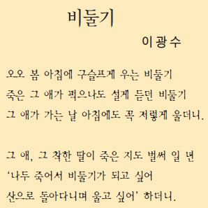 사학자 문일평의 1934년 2월 23일자 일기에는 다음과 같은 내용이 나온다. ‘출근했다. 이춘원의 여덟 살 난 아이가 상(喪)을 당했다는 소식을 처음 들어 전날 오후 6시쯤 그의 집에 가서 위문했다. 오후 3시 발인에 참가해서 미아리까지 따라갔다. 맑고 상당히 추웠다.’ 이광수는 소설가로 널리 알려져 있지만, 300편이 넘는 시와 시조를 발표했다. 그 중에서도 이 시조는 예술적으로 가장 성공한 것으로 평가되고 있는데, 1934년 죽은 딸아이에 대한 슬픈 기억을 작품에 담았다. 시인은 봄날 아침 구슬프게 우는 비둘기 소리를 듣고 죽은 딸아이를 생각한다. 죽은 딸을 그리워하는 아버지의 정이 듬뿍 담긴 작품이다.