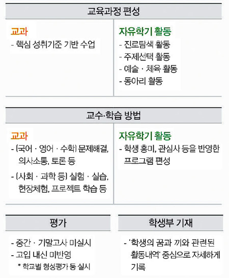 교육과정 편성은 핵심 성취기준 기반 수업의 교과 과정과 자유학기 활동으로 운영된다. 또 중간·기말고사를 실시하지 않으며, 학생부에는 ‘학생의 꿈과 끼와 관련된 활동내역’을 중심으로 자세하게 기재하게 된다.