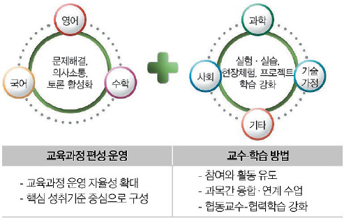 교과 과정은 문제해결, 의사소통, 실험·실습, 프로젝트 학습 중심으로, 자유학기 활동은 진로탐색활동, 주제선택 활동, 예술·체육활동, 동아리 활동 등 학생들의 흥미와 관심사를 반영하는 프로그램으로 구성·운영 된다.