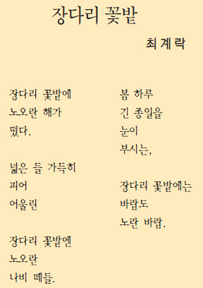장다리란, 배추나 무의 줄기를 말한다. 장다리꽃은 배추나 무의 장다리에서 피는 꽃이다. 배추에는 유채꽃 비슷한 노란색 십자화가 피고, 무에는 엷은 보라색 십자화가 핀다. 봄이 찾아와 장다리꽃이 흐드러지게 피면, 장다리 꽃밭에는 나비들이 떼 지어 날아들어 장관을 이룬다. 이 시에서 그려진 꽃밭은 배추장다리 꽃밭이다. “봄 하루/긴 종일을/눈이/부시는” 노란 꽃이 넓은 들 가득히 피어 있다. “장다리 꽃밭엔/노오란/나비 떼들”이 있는데, 노란 나비들과 어울려 있는 노란 꽃들도 시인에게는 ‘노오란 나비 떼들’로 보이지 않았을까. “장다리 꽃밭에 노오란 해가 떴다”고 노래할 만큼 꽃밭 전체에 노란 빛깔이 가득하니, “장다리 꽃밭에는/바람도/노란 바람”이라는 표현이 전혀 엉뚱하지 않고 오히려 당연하게 느껴진다.