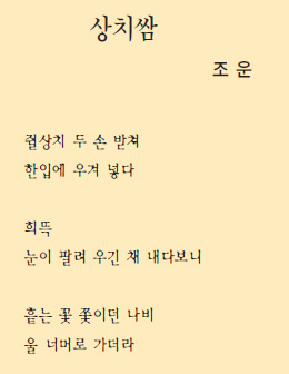 옛날에는 구중궁궐에 사는 대왕대비로부터 들일을 하는 농부에 이르기까지 남녀노소 가리지 않고 상치쌈을 즐겼다. 상치쌈은 상치 잎에 찬밥을 듬뿍 떠서 올려놓고 된장을 바른 뒤, 한입에 쑥 넣고 볼이 터지도록 먹어야 제 맛을 느낄 수 있다. 이 작품에서 시인은 그리 크지 않은 상치인 쥘상치를 두 손 받쳐 한입에 우겨 넣다가, ‘희뜩’ 눈이 팔려 무언가 지나가는 것을 본다. 흩날리는 꽃을 쫓아 울타리 너머로 날아가는 나비다. 일상의 한 순간을 포착하여 그 풍경을 탁월하게 형상화한 솜씨는 독자로 하여금 감탄을 자아내게 한다. 읽을수록 감칠맛이 나는 명시조이다.