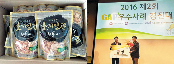 ○ 특 징 : 전국민이 인정하는 김포 금쌀로 100% 만들어지는 초지일관 누룽지. 최근 제2회 농산물우수관리(GAP) 우수사례 경진대회에서 영예의 금상(농림축산식품부장관상)을 차지해 신뢰도가 매우 높은 게으른농부영농조합법인이 만듭니다.