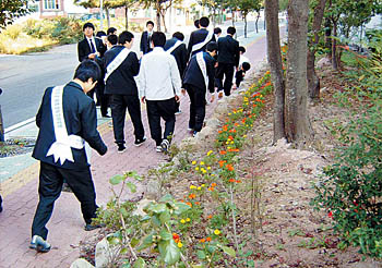 | <4-H회원들이 학교 주변 정화활동을 펼치고 있다. 울산정보고4-H회원들은 회원간 하나됨을 위해 노력한다.> |