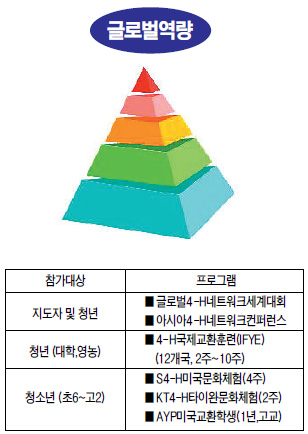 희망과 젊음을 상징하는 네잎클로버를 가슴에 새기고 4-H서약을 외치는 75개국의 4-H청소년과 지도자들이 함께하는 글로벌4-H네트워크는 우리 청소년들에게 글로벌 역량을 키울 수 있는 특별한 기회이자 자산임에 틀림없다.
