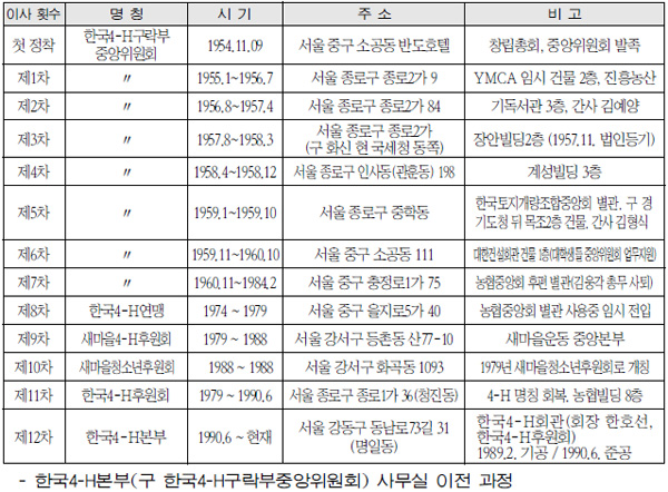 중앙위원회 창립 이래 63년이 흐르는 동안 우리 4-H의 ‘내 집’에 정착하기까지 타의에 의해 여러 차례 조직의 변천과 운영체제의 개편을 거듭하면서 오늘에 이르고 있다. 초창기 4-H구락부 운동에 많은 관심과 열의를 가진 사업가, 전직 고관, 교육인, 언론인들이 참여하여 순수한 농촌청소년 실천사회교육을 지원코자 했던 본연의 취지와 목적이 그 동안 본궤도에서 이탈되어, 우리가 정답게 어울은 4-H전통과 주체성은 지난 날 약간 훼손된 바 있었다. 1988년 서울 종로구 종로1가 농협빌딩(청진동 입구) 정문에 한국 4-H후원회라는 간판과 함께 ‘잊어버린 4-H’를 다시 되찾게 된 것은 450만 4-H인들의 강력한 염원이 있었다고 기록하고 싶다.