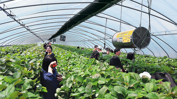 | 딸기농장에서 스마트팜을 견학 중인 서일고등학교4-H회원들. |