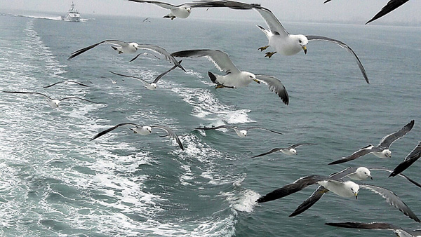 배 여행의 또 다른 재미는 갈매기의 아름다운 비행을 볼 수 있기 때문이다. 하얀 날개를 펴고 새우깡을 향해 달려드는 갈매기들. 움직이는 것들이 먹이를 향해 달려들 때의 원초적인 울음소리는 진홍빛 핏빛이다.