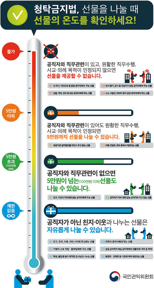따라서 △친구, 지인 등이 직무 관련 없는 공직자에게 주는 선물 △공직자가 직무 관련 없는 공직자와 주고받는 선물 △공직자가 직장 동료들과 주고받는 선물 등은 5만원을 넘어서도 가능하다.