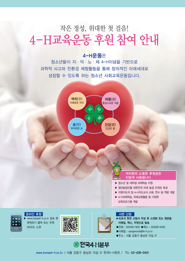 이를 위해 서면후원신청서를 작성하지 않고도 4-H홈페이지(www.korea4-h.or.kr)나 스마트폰을 통해 후원할 수 있도록 모금결제 환경을 구축했다. 큰 행사나 이벤트를 열지 않더라도 상시적으로 후원금을 낼 수 있는 길이 열리게 됐다.