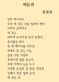 ‘목소리 큰 사람이 이긴다’는 말이 있다. 그래서일까? 사람들은 만나기만 하면 서로 싸울 듯이 목소리를 높인다. 이 시는 우리에게 목소리를 낮추라고 조용히 속삭인다. “손나팔을 하고/먼 데 메아리를 부르듯/외쳐도 못 듣”지만, “정작 가만 가만히 속삭이면 얼른 듣는다.”는 것이다. 바늘귀는 세상에서 가장 작은 귀이다. 아무리 급하여도 바쁘게 소리치면 듣지 못하고, 아무에게나 귀를 빌려 주지도 않는다. “귀에 가까이 눈을 두고/다정한 손길로 실 끝을 건네면/언제나 선뜻 빌려 준다.” 목소리 높여 자기 주장을 늘어놓지 말고, 조용히 남의 말에 귀를 기울이며 살자는 것이 이 시에 담긴 교훈이다.